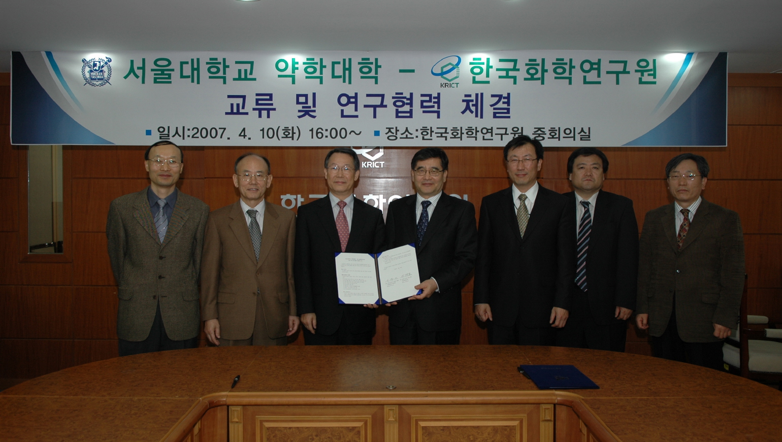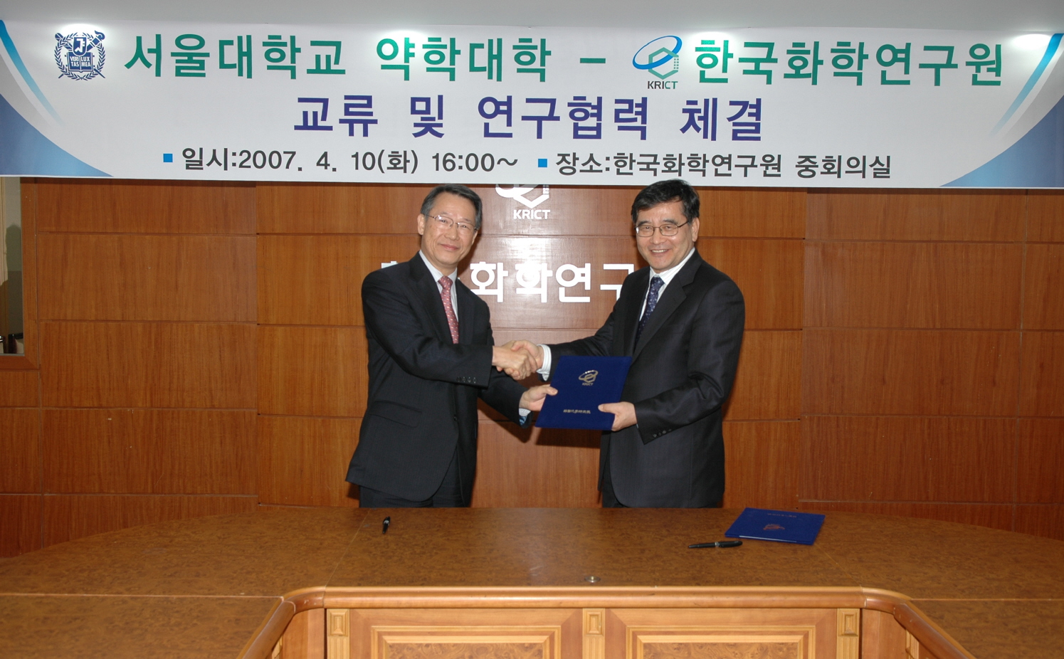 한국화학연구원은 서울대학교 약학대학(학장 이승기)과 2007년 4월 10일(화) 오후 4시 한국화학연구원 중회의실에서 신약개발을 위한 상호 교류와 협력을 위해 연구협력 협약을 체결하였다.
