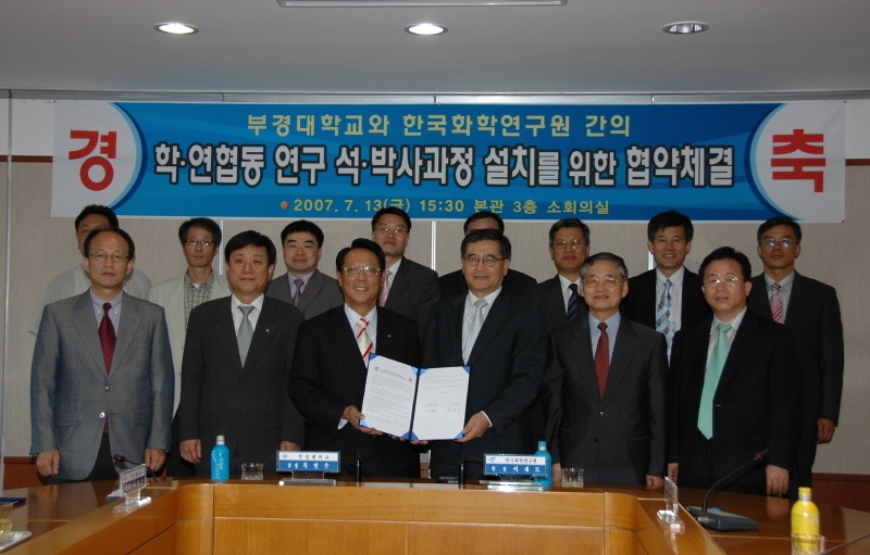 한국화학연구원(원장 이재도)은 부경대학교(부산시 남구 대연3동, 총장 목연수)와 2007년 7월 13일(금) 오후 3시 30분 부경대학교 본관 3층 소회의실에서 학연 협동연구 석박사 과정 설치를 위한 협약을 체결했다.