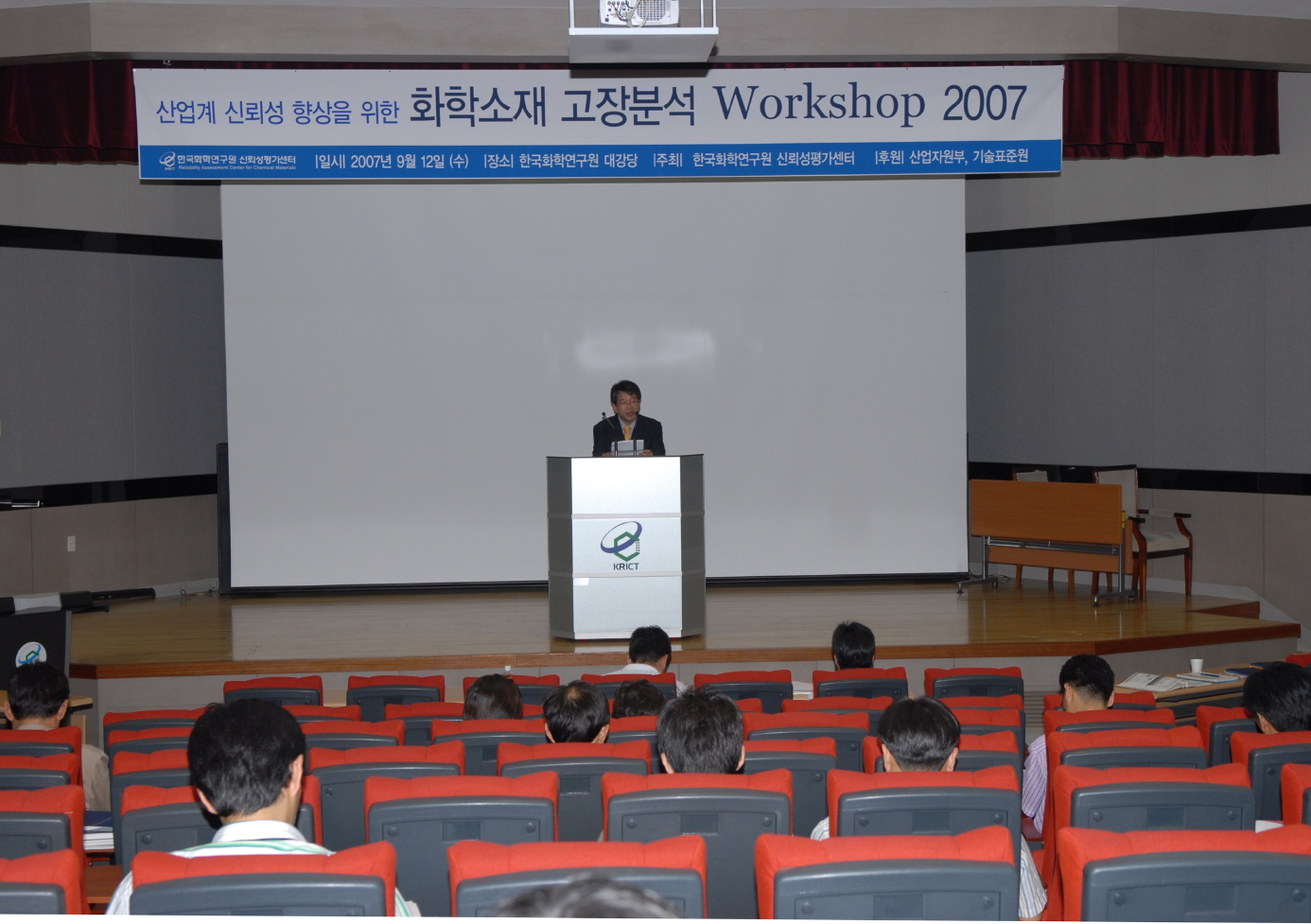 한국화학연구원(원장 李載道) 신뢰성평가센터 (센터장 崔吉濚)에서는 2007년 9월 12일(수) 한국화학연구원 강당에서 화학소재 관련 산업계 관계자 및 고장분석 전문가를 모시고 산업계의 화학소재 신뢰성 향상을 위한 “화학소재 고장분석 Workshop 2007”을 개최했다.