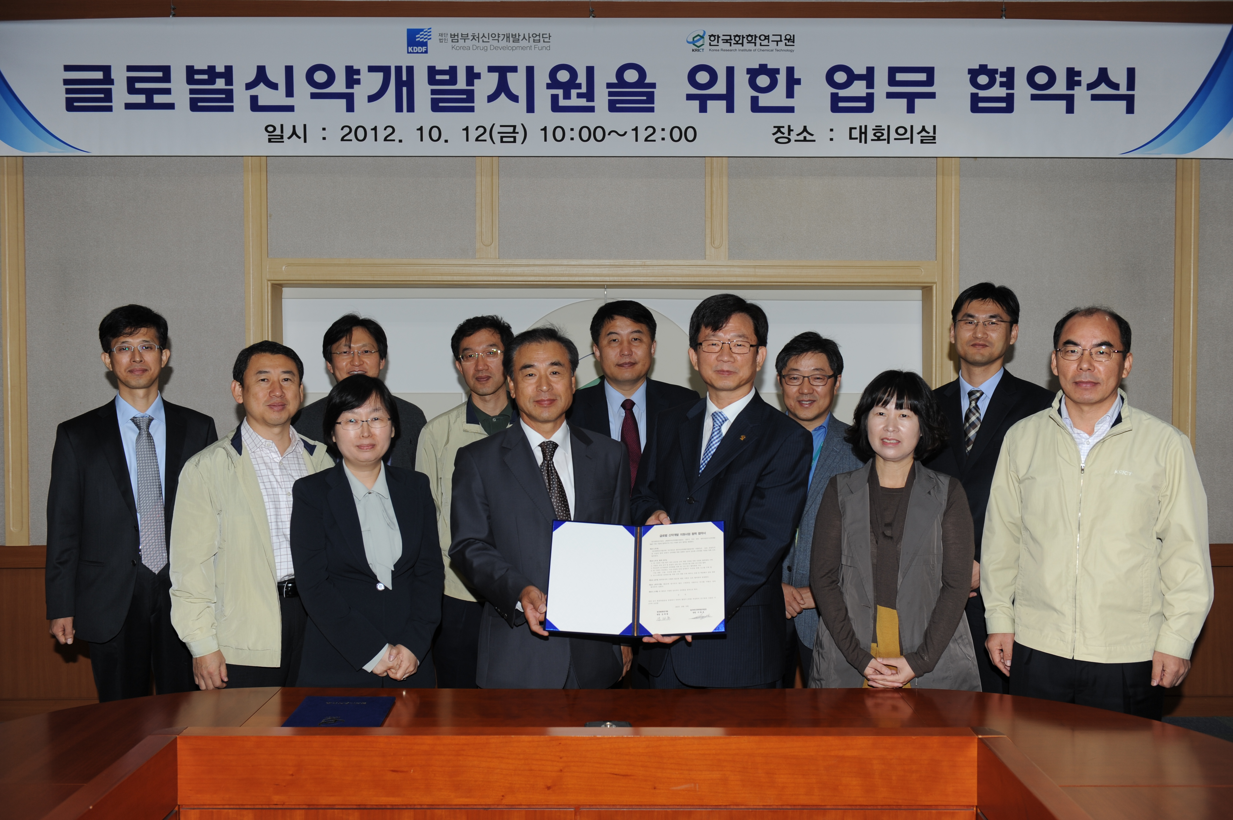 □ 한국화학연구원(KRICT, 원장 김재현)과 (재)범부처신약개발사업단(KDDF, 단장 이동호)은 10월 12일(금) 10시 한국화학연구원 대회의실에서 상호협력을 위한 업무협약식을 가졌다고 밝혔다.