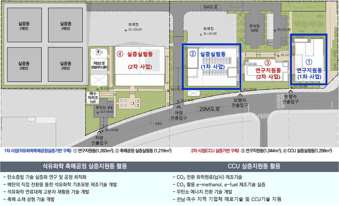 - 2차 시설은 이산화탄소 전환 기술 실증을 위한 ‘CCU 실증센터’로서 ‘탄소포집활용(CCU) 실증지원센터 구축 사업’ (2022~2026년, 총 283.7억원)으로 현재 건축 중이며, 2024년말 완공될 예정이다.