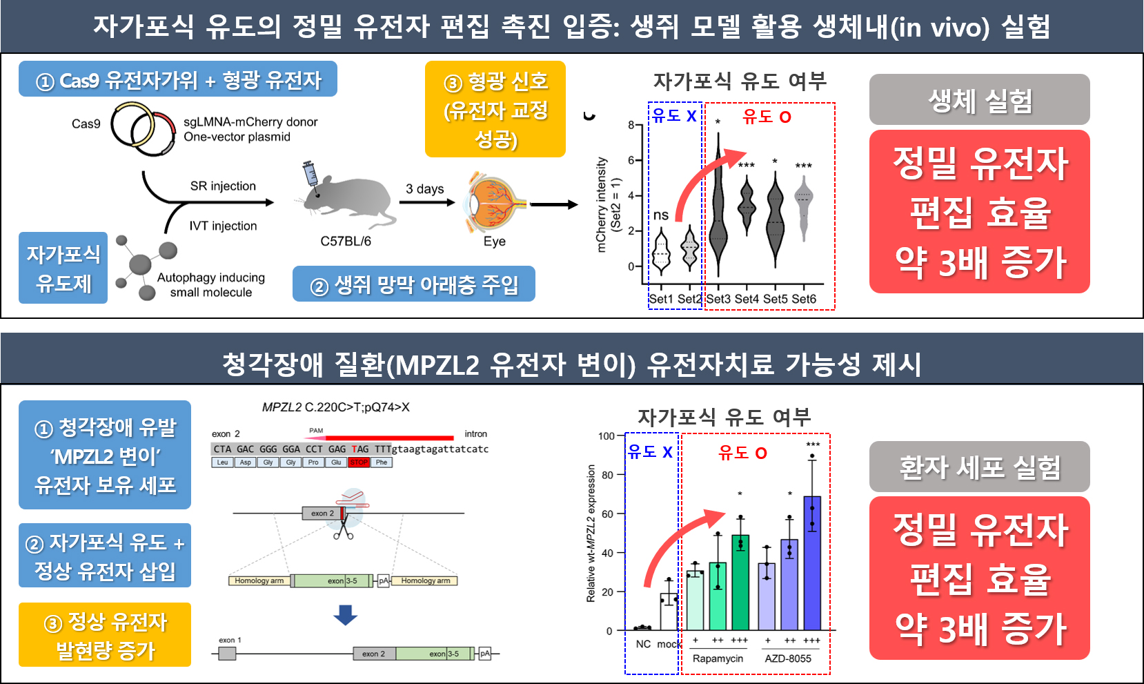 - 연구팀은 자가포식 유도로 HR 기반 편집 효율 최대 3배 증가, 기존의 낮았던 편집 정확도 개선