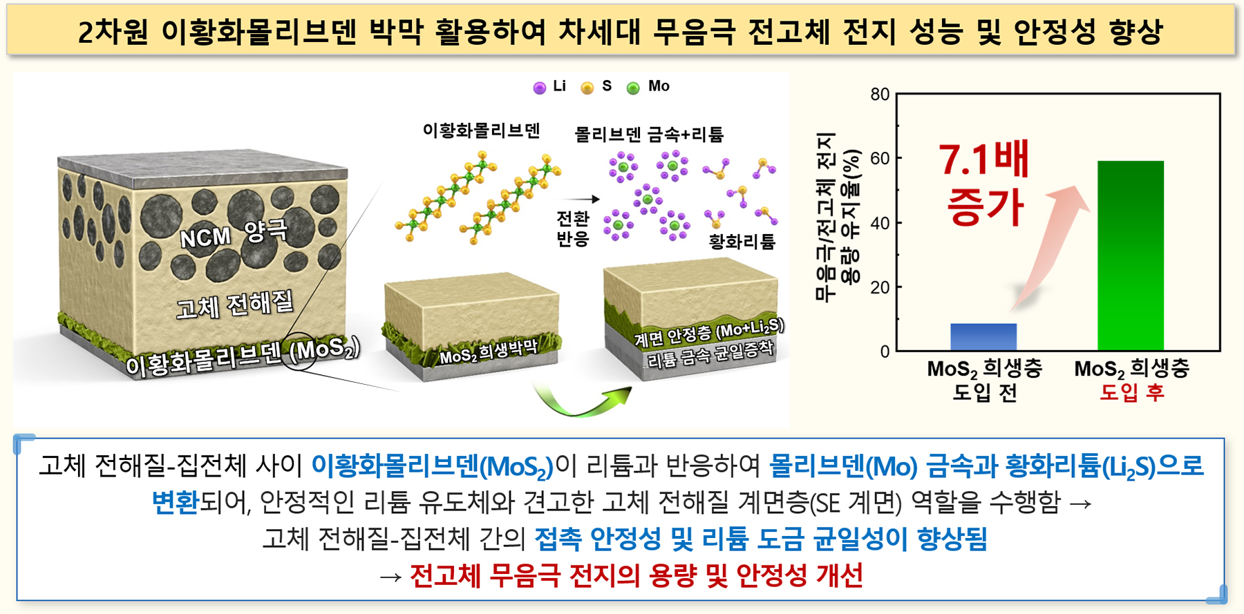 - 고가 귀금속 대신 저렴한 이황화몰리브덴(MoS2) 박막 이용해, 무음극 전고체 전지의 불균일 리튬 도금 및 계면 불안정성 문제 해결