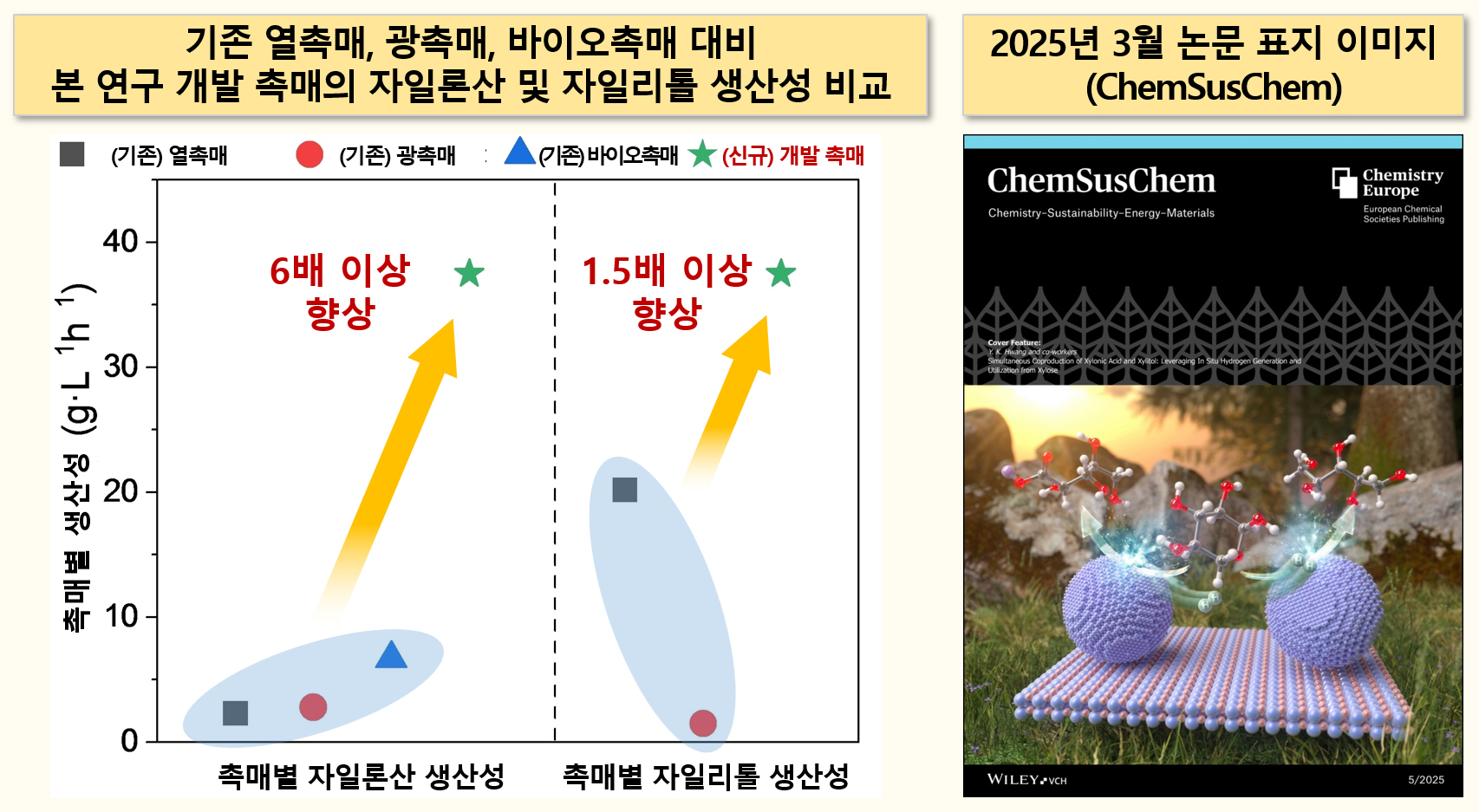 < [그림 1] (왼쪽) 기존 열촉매, 광촉매, 바이오촉매 대비 본 연구 개발 촉매의 자일론산 및 자일리톨 생산성 비교, (오른쪽) 논문 표지 이미지>