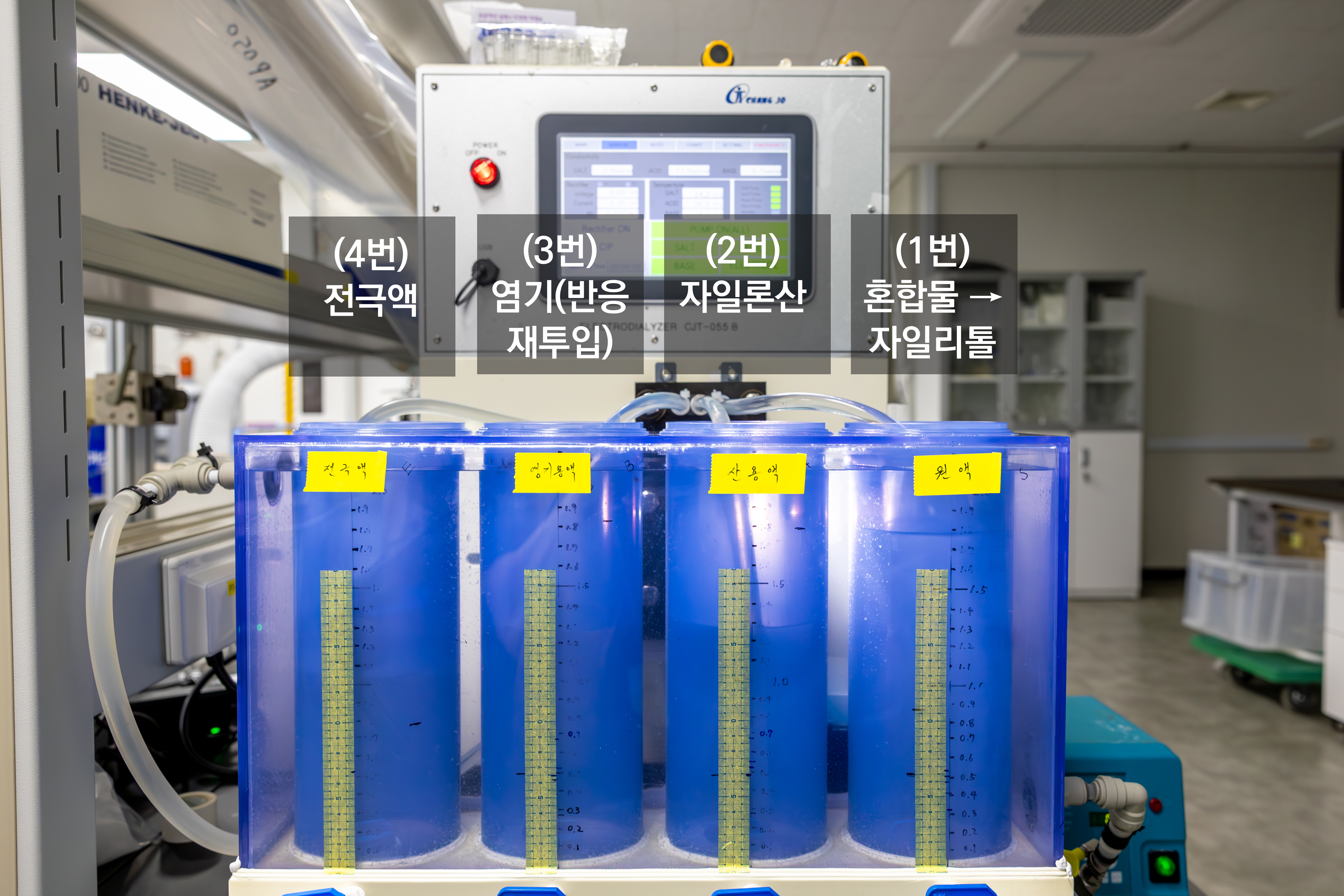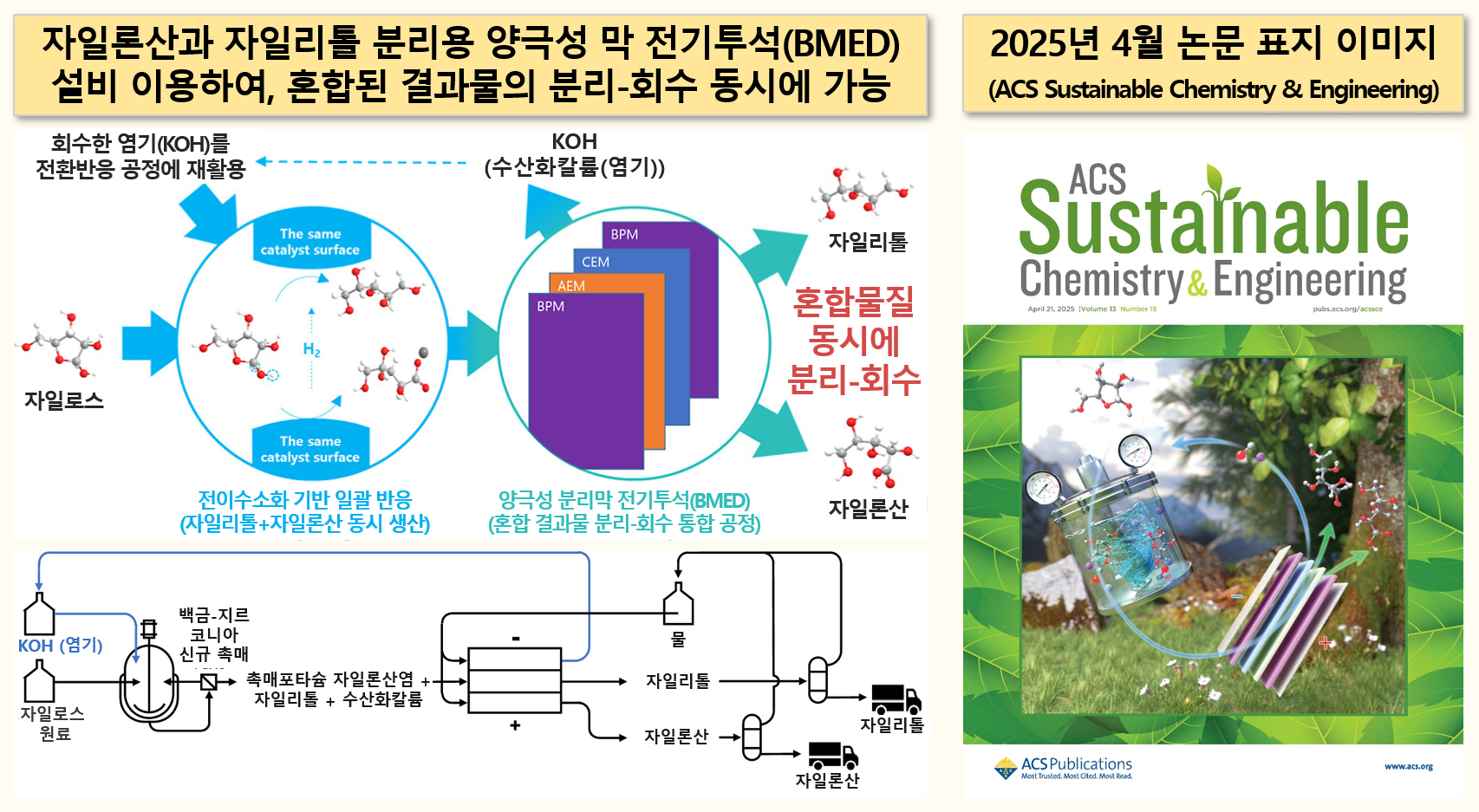 ㅇ 또한 올해 4월에는 후속 연구를 통한 저에너지 통합 공정도 발표했다. 반응 후에는 자일론산·자일리톨·염기가 마치 건더기·국물·양념처럼 섞여 있는 혼합물이 생성된다. 연구팀은 ‘양극성분리막 전기투석 (BMED)’ 공정을 이용해 이를 한번에 분리했고, 90% 이상 회수된 염기는 반응에 재사용할 수도 있다.