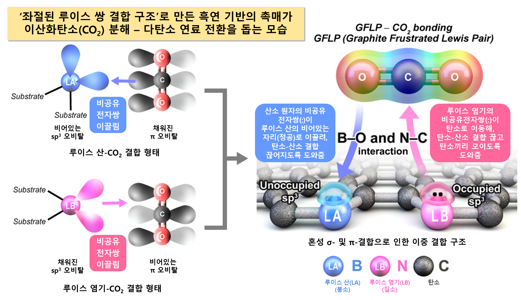 ㅇ 이번 개발 촉매는 카본(흑연, Graphite) 소재에 루이스 산(붕소(B))과 루이스 염기(질소(N))가 동시에 함유된 ‘좌절된 루이스 산-염기쌍 (FLP, Frustrated Lewis Pairs)’* 구조로 만든 BN-GFLP 물질이다. 이 촉매는 상온·상압에서 CO₂의 탄소와 산소의 분해·결합 반응성을 동시에 높여 전환 효율이 뛰어나다.