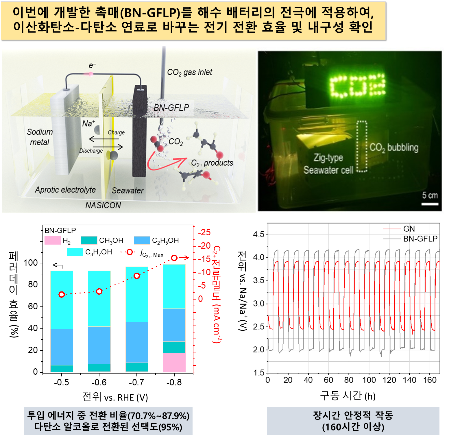 ㅇ 이렇게 분해·결합된 탄소는 3가지 종류의 알코올 즉, 메탄올(CH₃OH), 에탄올(C₂H?OH), 프로판올(C₃H?OH)과 수소, 일산화탄소로 바뀐다. 해수 배터리에 적용해 실험한 결과, 기준 전압(가역 수소 전극 전압) 대비 0.7V 낮은 상태에서 투입 에너지 중 87.9%가 변환에 쓰였다. 변환된 물질 중 다탄소 알코올(에탄올, 프로판올)의 비중인 선택도는 95%였으며, 160시간 이상 안정적으로 작동했다.