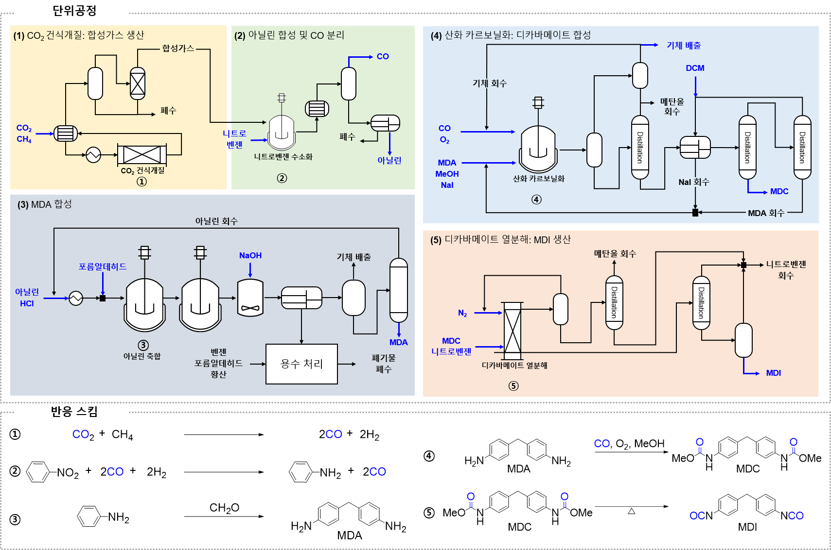 ㅇ 연구팀은 포스겐 없이 MDI를 제조하기 위해 2가지 공정을 변경했다. 첫 번째는 기후위기 유발 온실가스 1, 2위인 ‘메탄과 CO₂’를 반응시켜 ‘일산화탄소·수소’가 섞인 합성가스로 바꾸는 ‘CO₂ 재활용 공정’이다. 두 번째는 ‘포스겐’ 대신 ‘메탄올, 일산화탄소, 산소’를 반응시켜 다른 중간 물질로 바꾼 뒤 MDI를 만드는 ‘포스겐 대체 공정’이다.