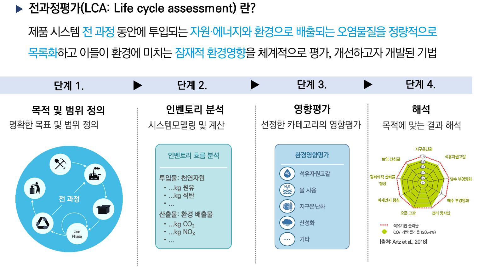 * 전과정 평가(LCA, Life Cycle Assessment) : 제품의 원료 채취·생산·유통·사용·폐기까지 전체 과정에서 자원·에너지, 환경 배출 오염물질을 정량화해, 잠재적 환경영향 평가
