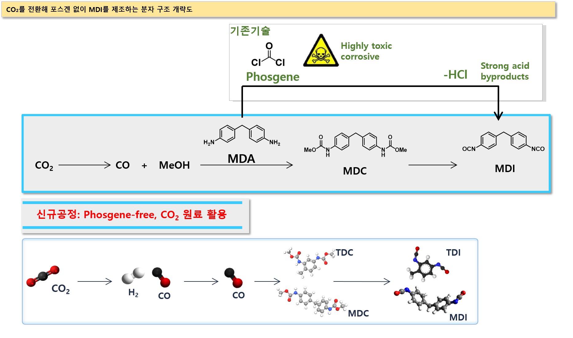 ㅇ 한국화학연구원(원장 이영국) 이진희, 안진주, 박지훈 박사 연구팀은 최근 이산화탄소를 원료로 사용하는 새로운 MDI 제조 촉매와 공정을 개발했다. 이 기술은 기존 방식보다 이산화탄소 배출과 인체·환경적 유해 요소를 줄여준다. 또한 합성 부산물을 줄여 생산 효율도 높였다.