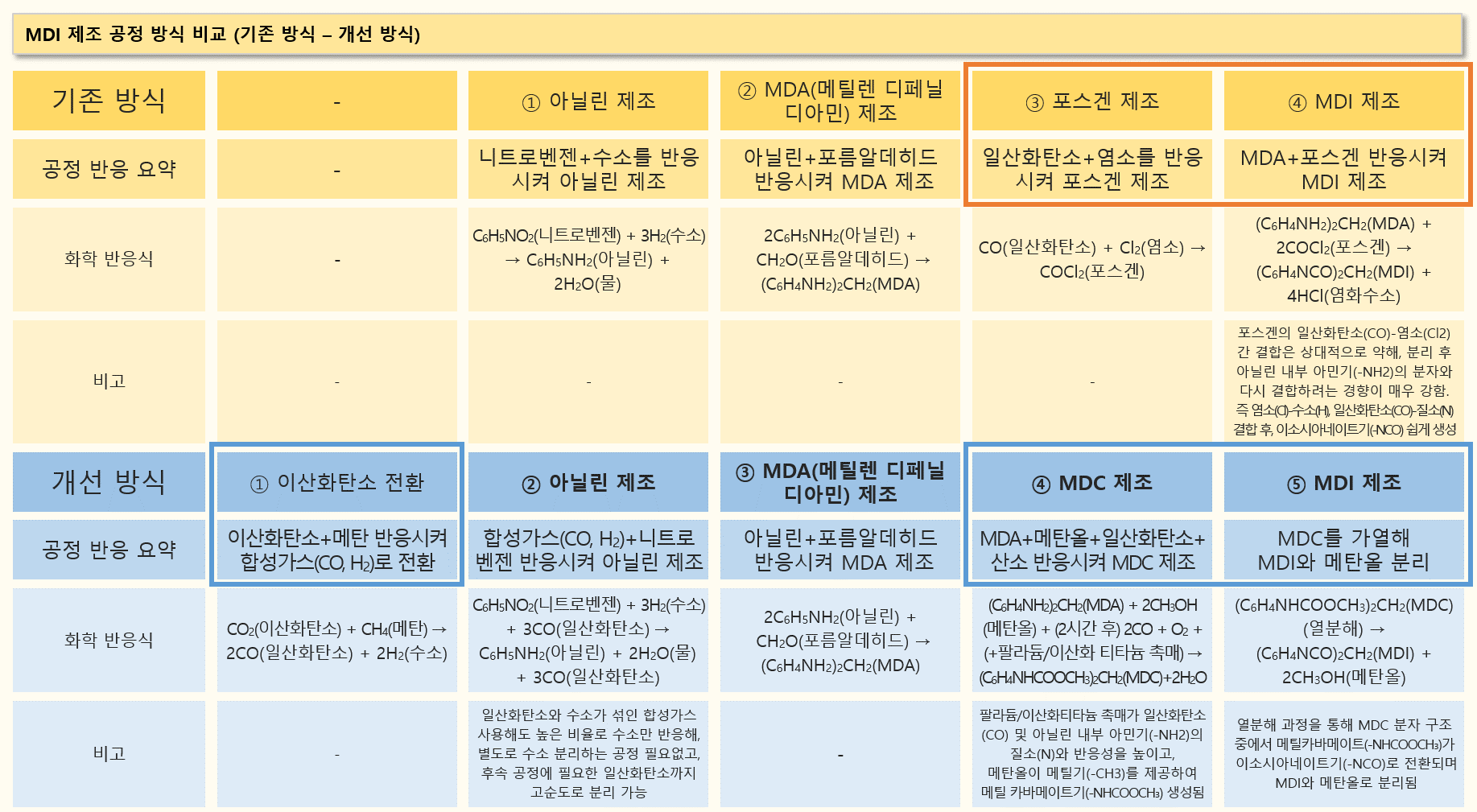 ㅇ 기존 MDI를 생산하는 방식은 크게 4단계로 구분된다. 1번 아닐린 제조(니트로 벤젠, 수소 반응), 2번 MDA(디페닐 메틸 디아민)라는 중간 물질 제조 과정(아닐린, 포름알데히드 반응), 3번 포스겐 제조 과정, 마지막 4번 과정에서 MDI 제조(MDA, 포스겐 반응)가 이뤄진다.