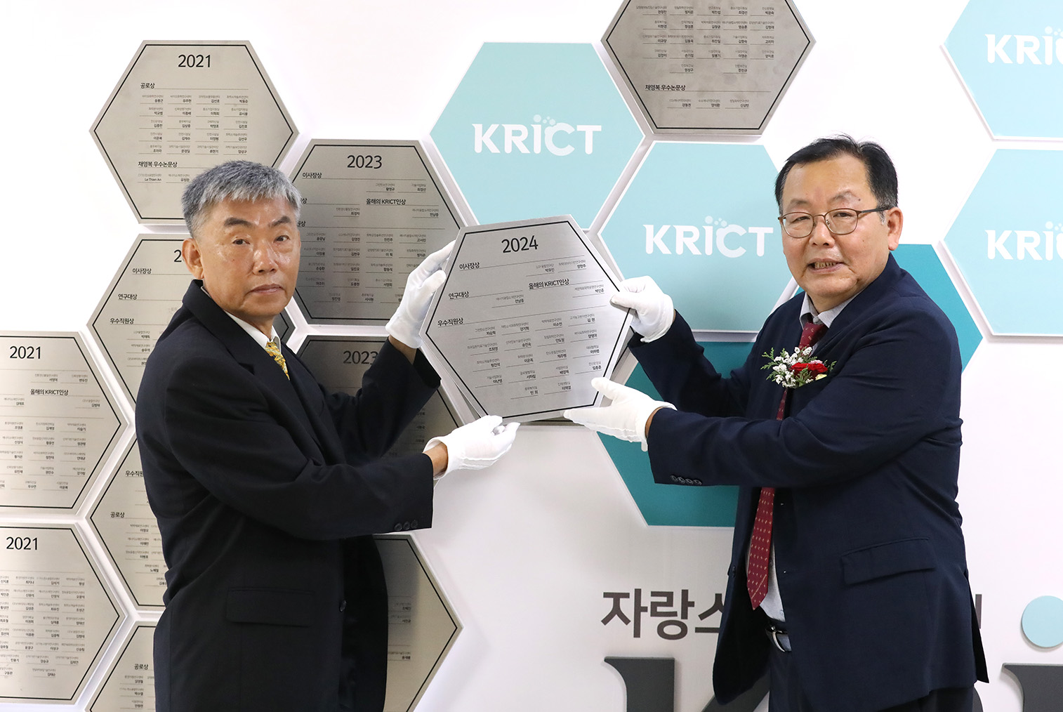<올해의 KRICT인상을 받은 박인준 책임연구원과 이영국 원장이 명패 부착식을 하는 모습(좌 박인준 책임연구원, 우 이영국 원장)>