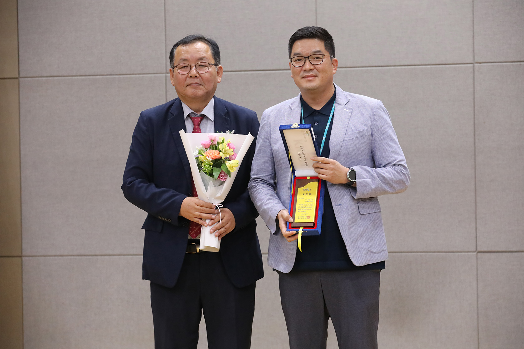 <올해의 KRICT인상을 받은 박인준 책임연구원(좌 이영국 원장, 우 박인준 책임연구원)>