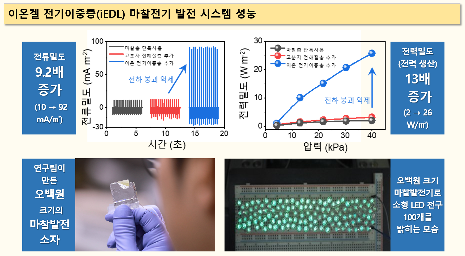 ㅇ 마찰전기 발전 성능 시연에서 iEDL 소재를 적용하지 않았을 때에 비해 일정 시간 동안 생산되는 전력의 양, 즉 전력 밀도는 13배(2→26W/㎡)로 증가되어, 매우 효율적인 발전 성능을 보여주었다.