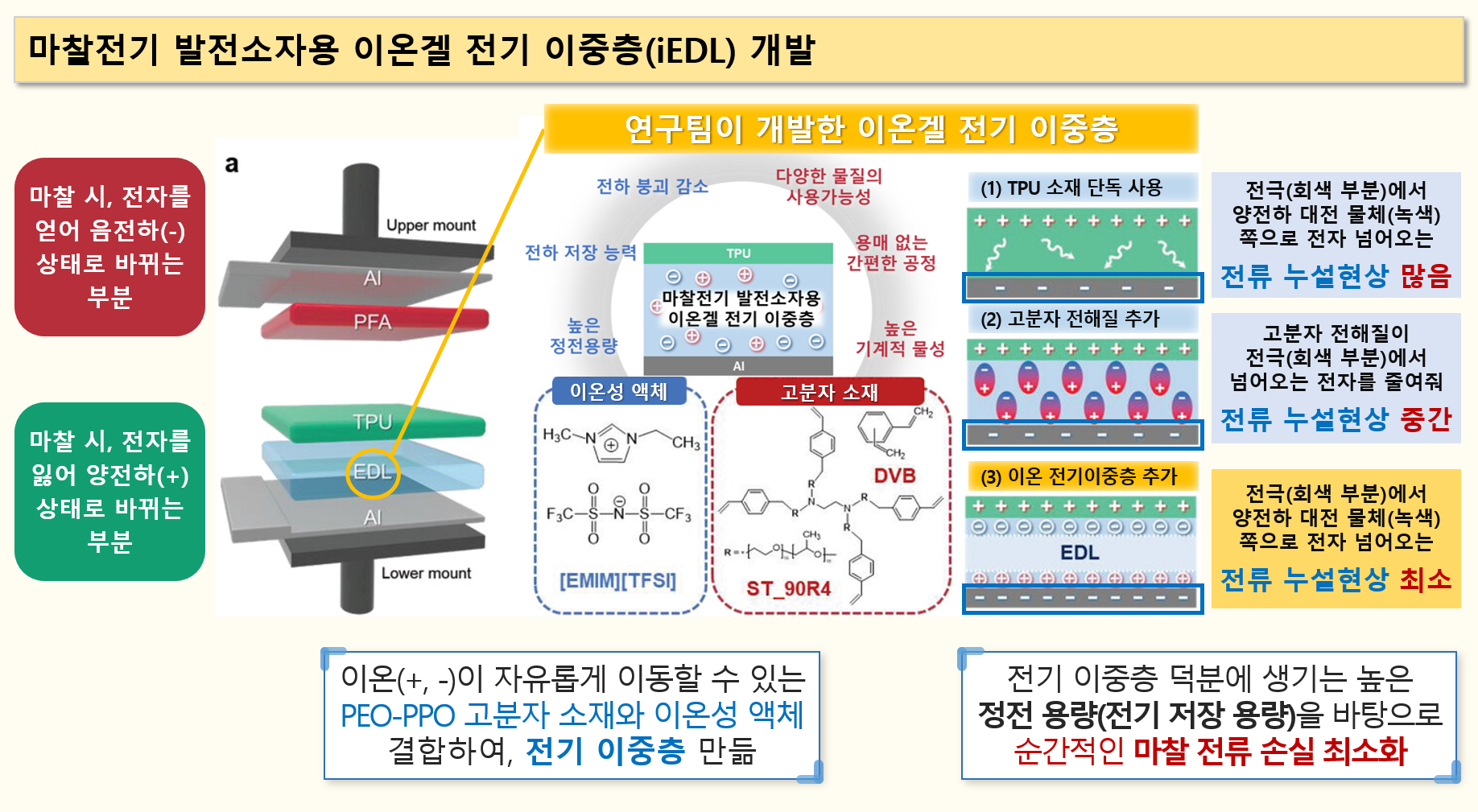□ 연구팀은 마찰 소재와 전극 사이에 ‘이온 겔 전기 이중층(iEDL, Ionic Electric Double Layer)’ 소재를 추가해 전류 누설 문제를 해결하고 전력 발생량을 높였다. ‘이온겔 전기 이중층’은 전해질과 전극 표면 사이에 형성되는 두 개의 전하 층을 의미하는데, 여기서는 이온성 액체를 얇게 굳힌 막을 이용해, 마찰 후 생성된 전하 상태가 유지되도록 안정적으로 고정시키는 역할을 맡았다.