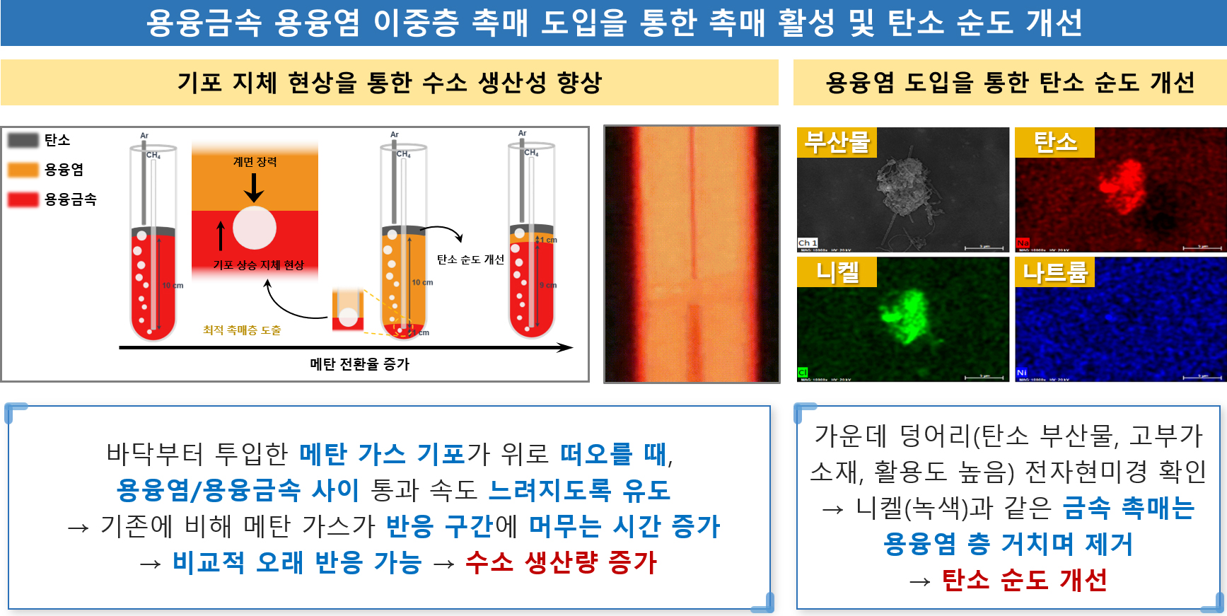 ㅇ 연구팀은 기존의 고체 촉매 대신, 액체 상태로 유지되는 용융 금속 촉매를 사용했다는 특징이 있다. 용융 금속 촉매는 메탄 열분해 과정에서 생성되는 탄소를 물리적으로 분리하기 용이하여 장시간 안정적인 반응이 가능하다.