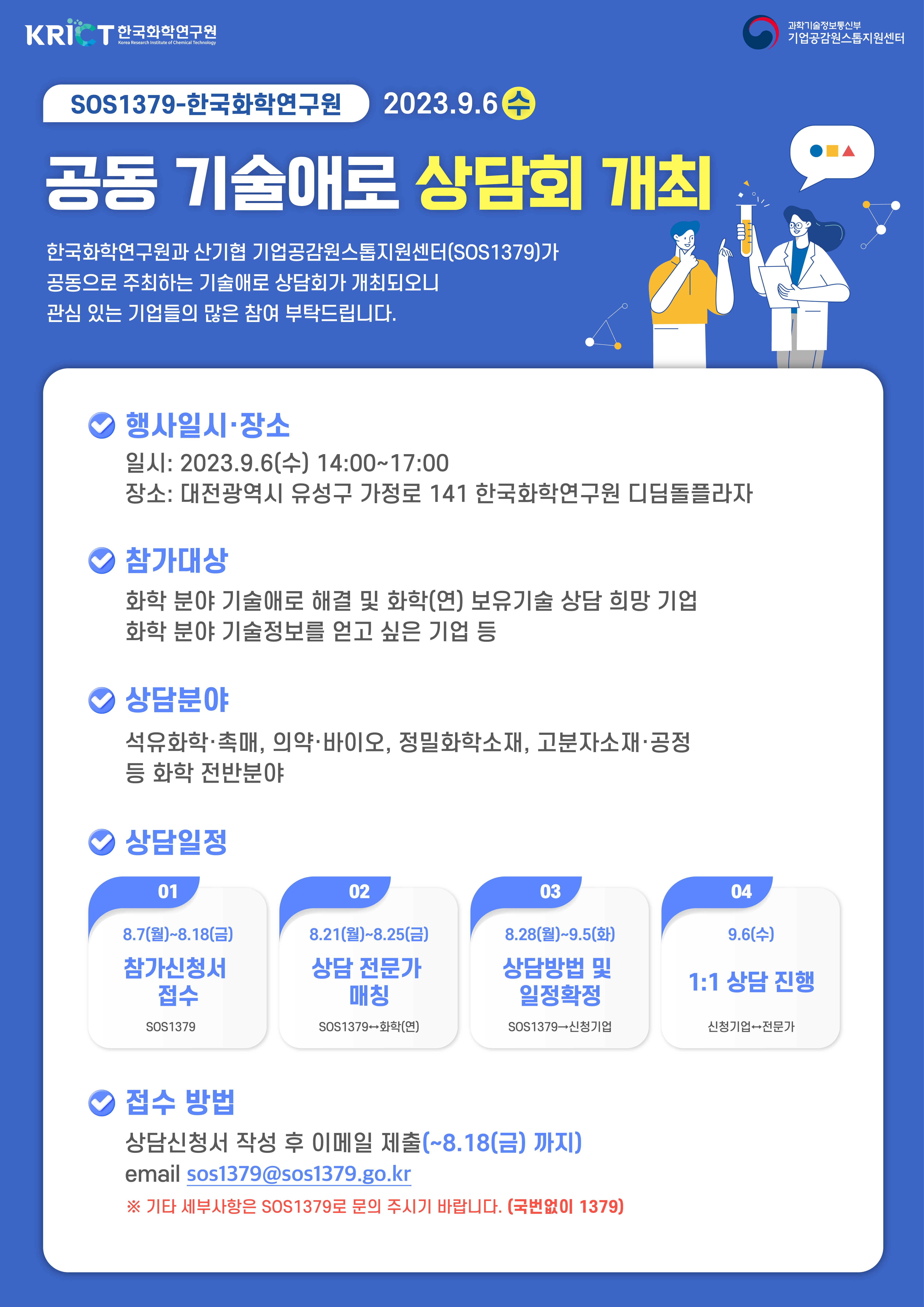 한국화학연구원과 산기협 기업공감원스톱지원센터(SOS1379)가 공동으로 주최하는 기술애로 상담회가 개최되오니 관심 있는 기업들의 많은 참여 부탁드립니다.