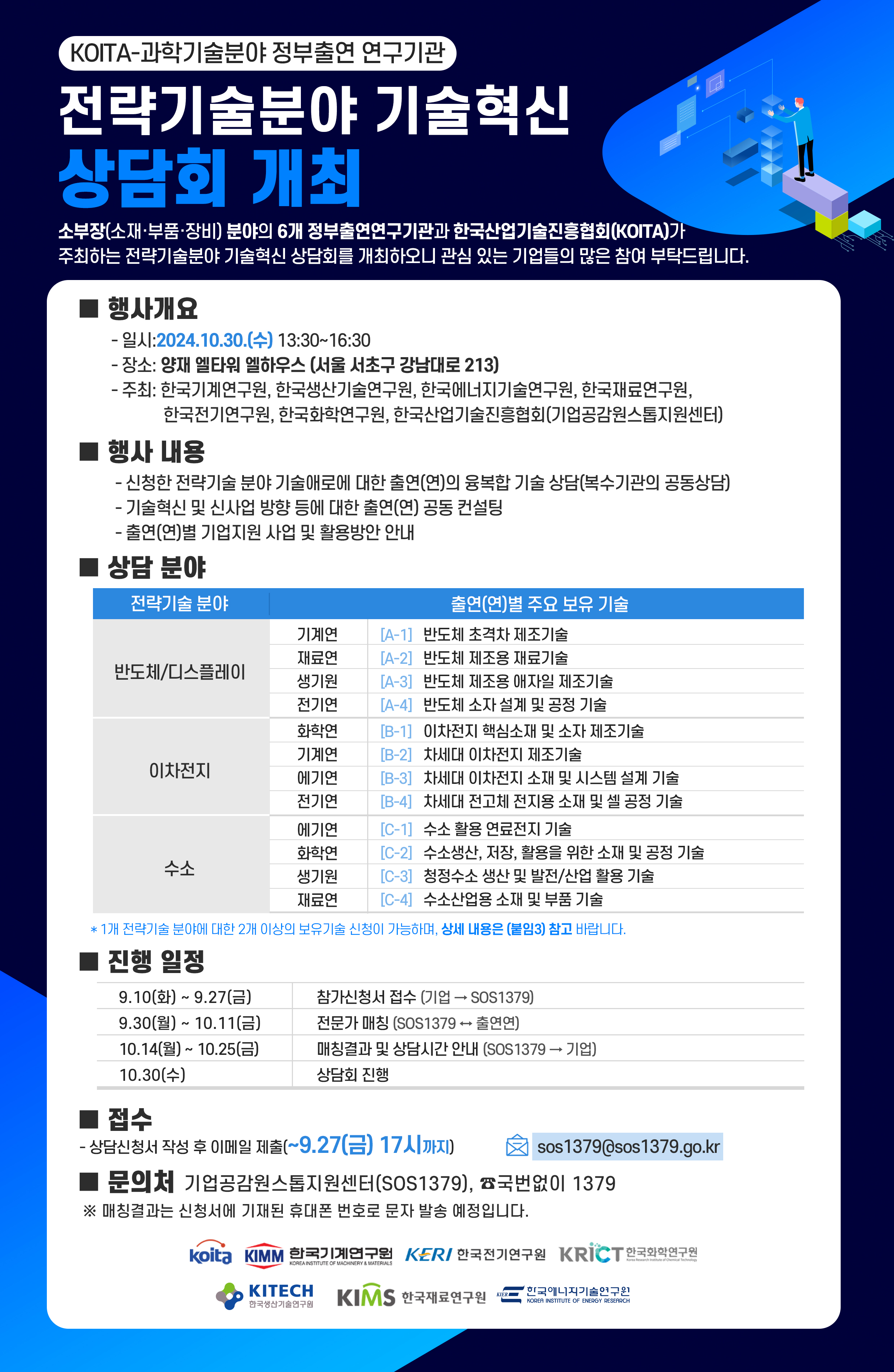 한국화학연구원과 정부출연연구기관-한국산업기술진흥협회(KOITA)가 주최하는 전략기술분야 기술혁신 상담회를 아래와 같이 개최하오니, 많은 관심 부탁드립니다.(첨부1 포스터 참고)