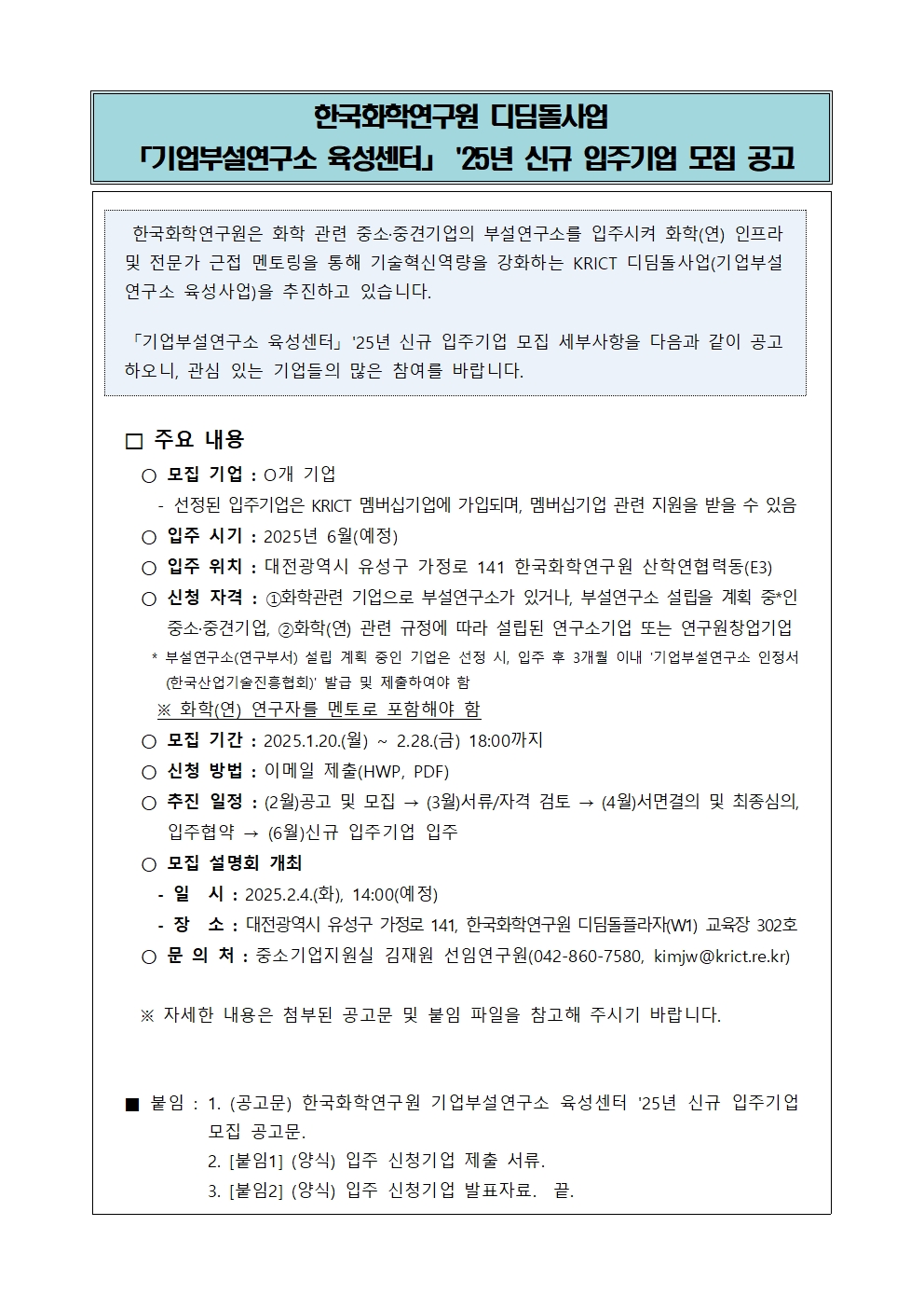 (공고문) 한국화학연구원 기업부설연구소 육성센터 '25년 신규 입주기업 모집 공고문