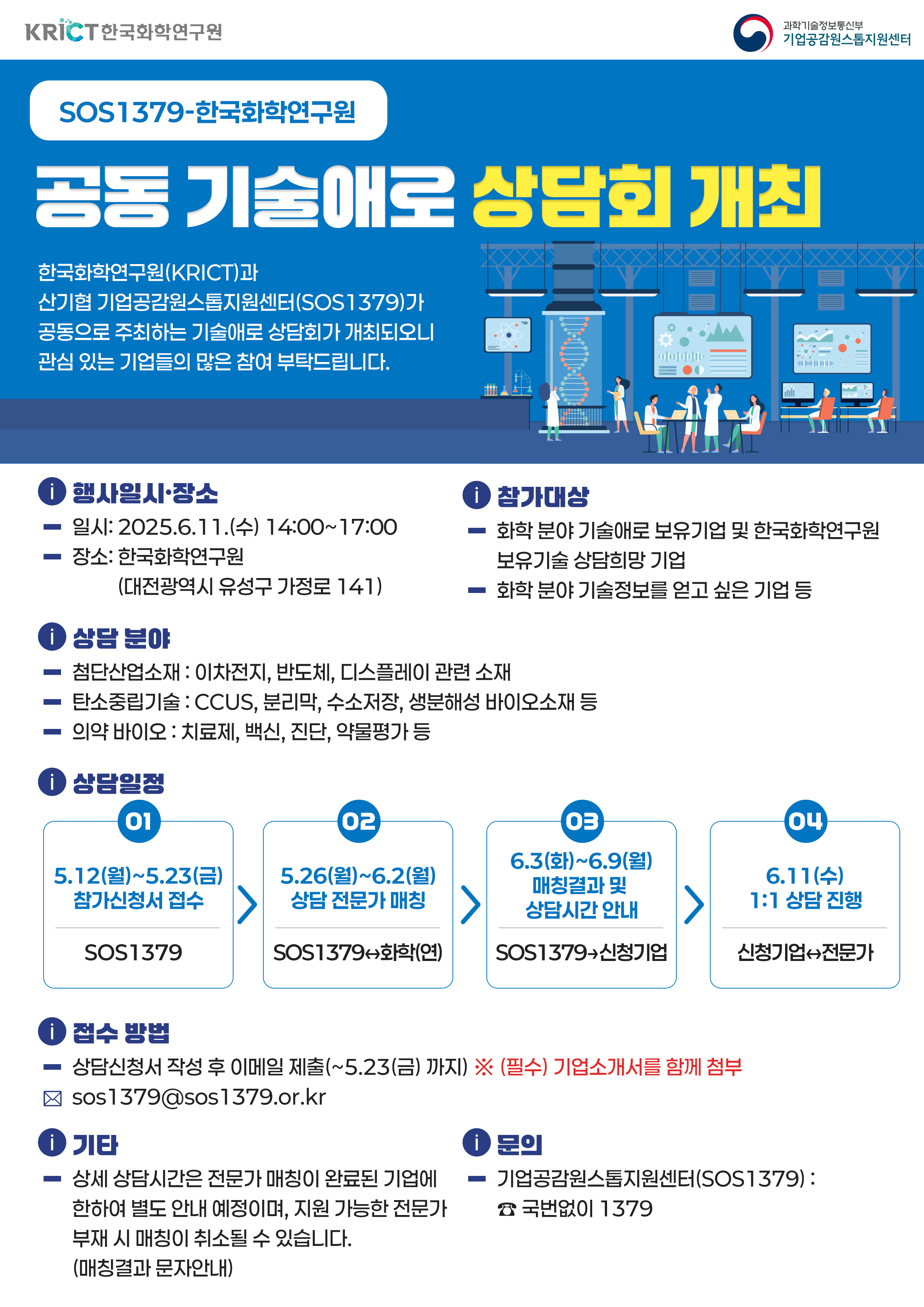 한국화학연구원(KRICT)과 산기협 기업공감원스톱지원센터(SOS1379)가 공동 주최하는 "2025년도 KRICT-SOS1379 공동 기술애로 상담회"를 아래와 같이 개최하오니, 많은 관심 부탁드립니다.(첨부1 포스터 참고)