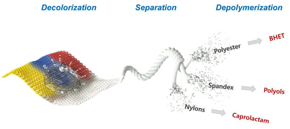 조정모 박사팀의 ‘폐섬유의 화학적 재활용 기술’은 세계 화학계를 대표하는 미국화학회(ACS) 창간 10주년 기념 저널의 표지를 장식할 만큼 국제적으로 큰 주목을 받고 있는 세계 최초의 폐섬유 재활용 기술입니다. 버려지는 옷은 유색 혼방 소재가 대부분이라 선별과 분리가 어려운 것으로 알려져 있으며, 이에 따라 소각이나 매립 외에 달리 처리 방법이 없었습니다. 개발한 기술은 이러한 의류 쓰레기 발생량을 획기적으로 줄일 수 있는 친환경 기술이지요.