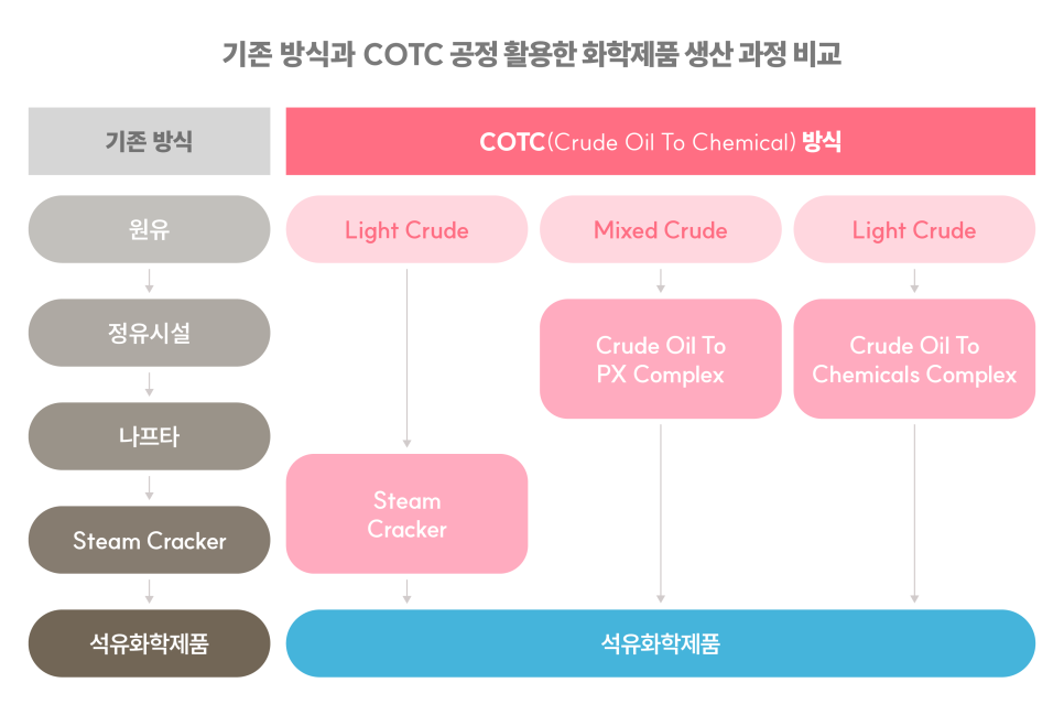 기존의 석유화학산업에서는 산유국에서 길어 올린 원유를 정유시설로 옮겨 휘발유, 경유, 등유 등으로 정제하고 나프타를 이용해 석유화학의 쌀로 불리는 에틸렌과 프로필렌 등의 기초원료를 생산하고 있습니다. 반면 COTC(Crude Oil To Chemical)는 이런 중간 과정 없이 원유에서 곧바로 모든 석유화학제품을 일괄생산 하는 시스템입니다. COTC의 또 다른 장점은 기초유분의 생산 비율이 기존 석유화학 공정(8~10%)보다 월등히 높은 50~80%에 이른다는 것입니다. COTC 기술은 산유국들에게는 선택이 아닌 필수적인 기술 솔루션입니다. 게다가 대규모 석유화학 산업단지를 보유한 나라들로 원유를 실어 보낼 필요가 없으니 운송료, 관세 절감은 물론 한국, 일본, 미국 등의 석유화학 강국이 올려온 고수익의 중간마진까지 온전히 독식할 수 있게 됩니다.