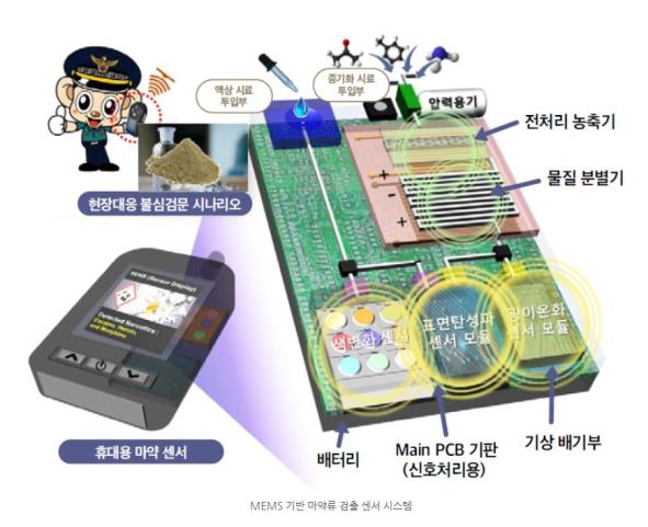화학연 박막재료연구센터는 이미 10여 년에 가까운 마약 감지 센서 연구로 16종 이상의 마약류 감지 센서 기술을 개발하며 마약 확산 방지에 큰 힘을 보태고 있습니다. 마약류의 정확한 분석을 위해서는 샘플을 채취해 실험실에 가져와 분석해야 했던 것을 현장에서 실시간으로 탐지할 수 있도록 하고 있는 것이지요.