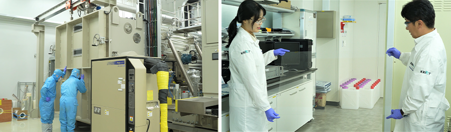세계 최고 수준으로 평가받고 있는 화학소재솔루션센터의 코팅 테스트베드는 첨단 정보통신 디바이스와 미래 모빌리티 등에 적용되는 디스플레이, 터치패널, 이차전지, 태양전지, 스마트윈도우 필름 등의 고기능성 필름 소재의 개발을 지원하는 시설입니다. 이를 위해 필름·코팅 등 매우 높은 수준의 청정 환경을 요구하는 공정에서 공기 중 입자의 농도, 온도 및 습도를 제어하며 일정한 청정도를 유지하는 공정시설인 클린룸(1,000㎡)과 준클린룸(230㎡)을 갖추고 습식코터, 스퍼터, 화학기상증착장비 등 6종의 파일럿 습식 및 건식 코팅 공정장비, 롤투롤 레이저패터닝 장비와 평가·측정 장비, 용액제조 부대장비 등 특수 코팅 인프라 구축을 계속해왔습니다.