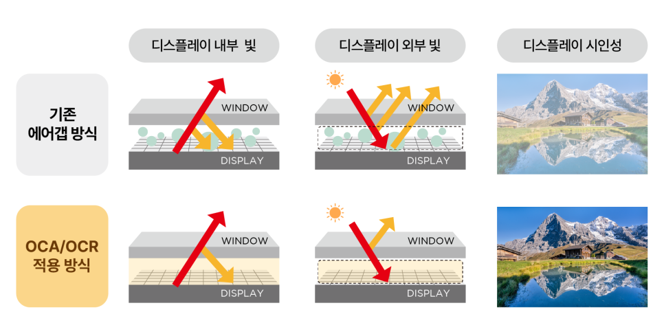 점·접착제의 중요도가 높아지고 있는 것은 다양한 소재와 미세한 부품들의 정교한 집합체인 ICT 산업에서도 마찬가지입니다. 디스플레이용 점·접착제인 OCR(투명접착제)과 OCA(투명테이프)가 대표적입니다. 디스플레이는 핵심부품인 디스플레이 패널 위에 터치스크린 패널, 커버 윈도우 등 많은 요소들로 구성됩니다. 따라서 다양한 종류의 부품을 쓰는 데 따른 빛 손실과 반사, 정전기, 전자파, 발열과 오염, 수분 침투 등을 막기 위해 더욱 뛰어난 광학적 특성과 점탄성·내구성의 점·접착제 소재와 기술 개발이 요구되고 있습니다.