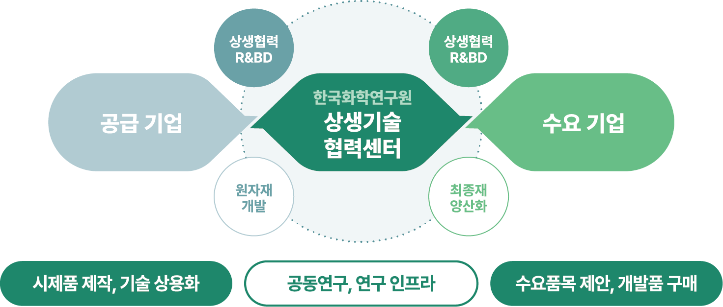이에 따라 정부는 2021년 화학소재·부품 기술의 국가적 혁신 역량 강화를 위해 화학연 내에 상생기술협력센터 구축을 결정했습니다. 화학연의 전문 R&D 역량을 기반으로 공급기업과 수요기업이 동반 성장할 수 있는 생태계를 조성하려는 것이지요.