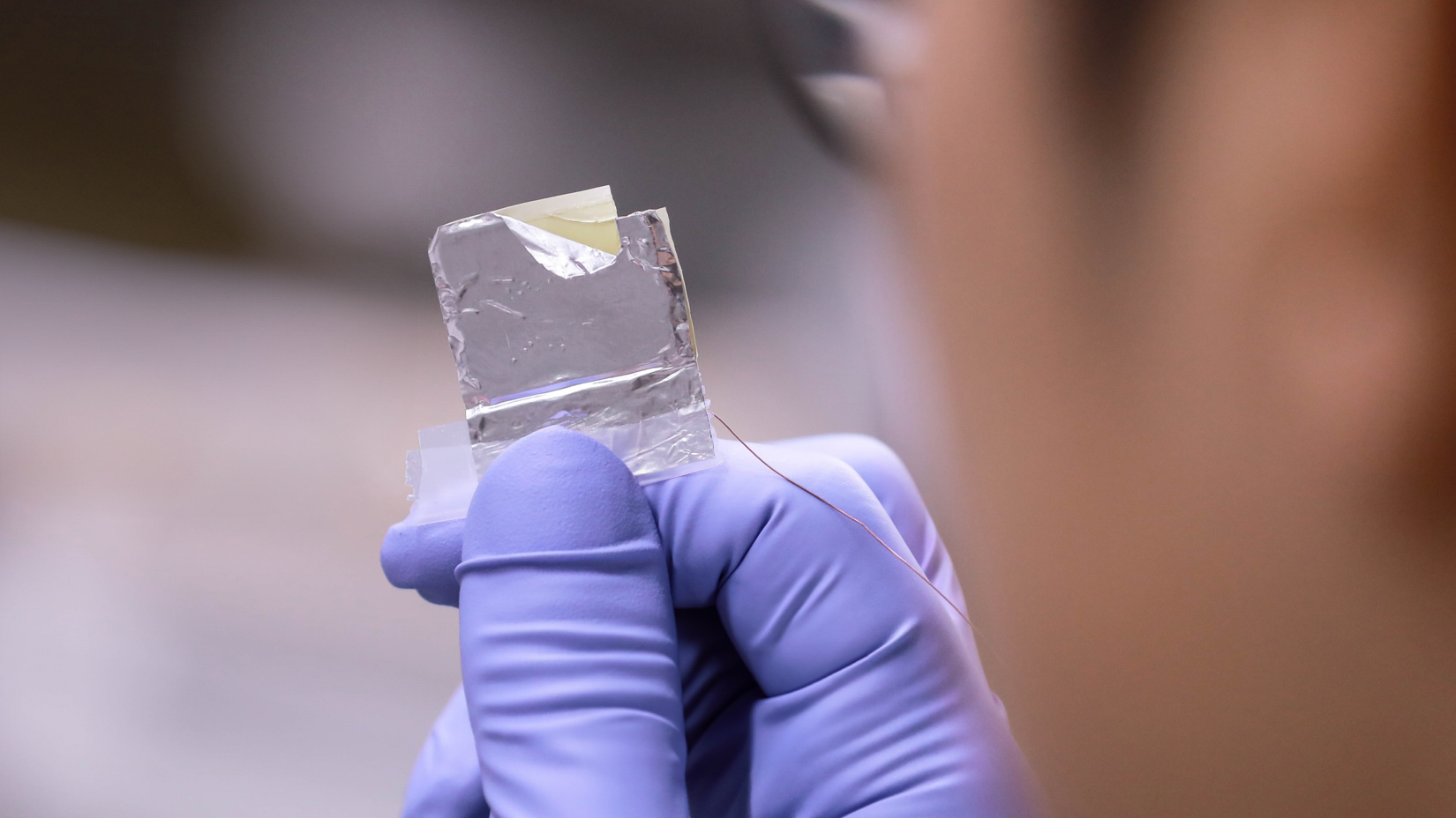 화학연이 개발한 마찰발전 소자. 가장 앞쪽부터 은박재질 전극과 전선 - 가운데 이온겔 전기이중층 소재 - 뒤쪽의 마찰 소재 순서로 결합되어 있는 모습