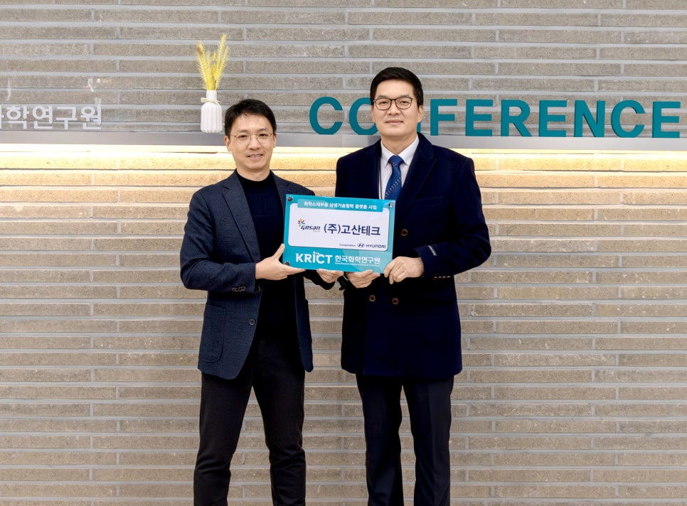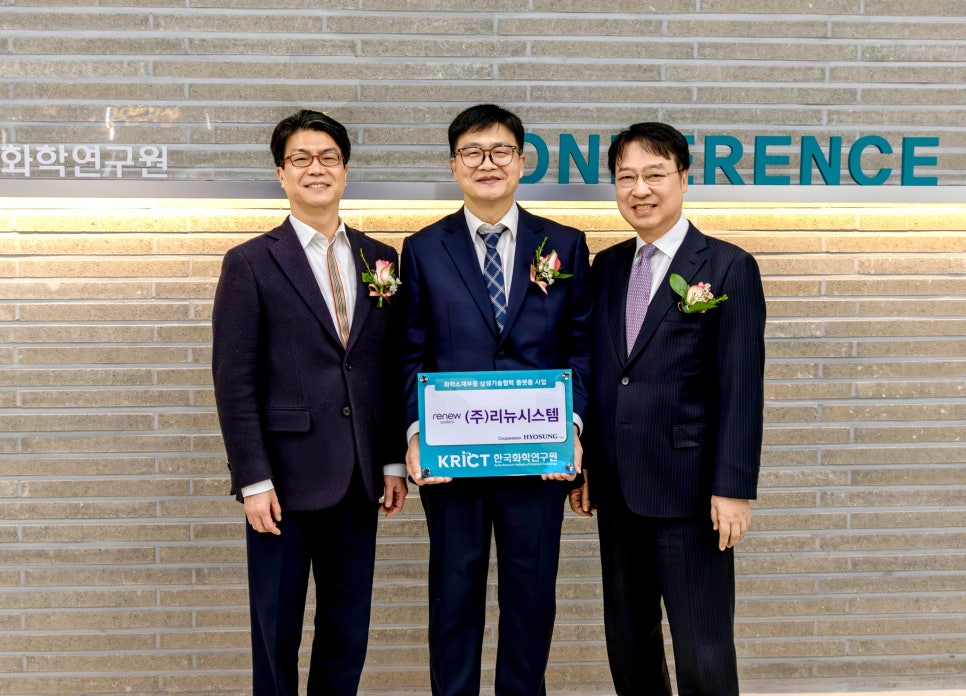 대표(오른쪽)와 조정모 화학연 박사(가운데), 이재우 효성티앤씨 부문장(왼쪽)이 입주컨소시엄 현판을 들고 기념촬영을 하고 있다