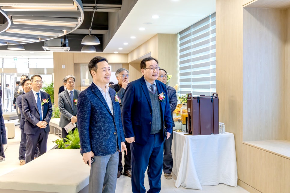 이영국 화학연 원장(앞줄 오른쪽) 대전시 이택구 정무경제과학부시장 등 참석자들이 최경선 중소기업지원센터장의 1층 기업 홍보 공간을 설명을 듣고 있다