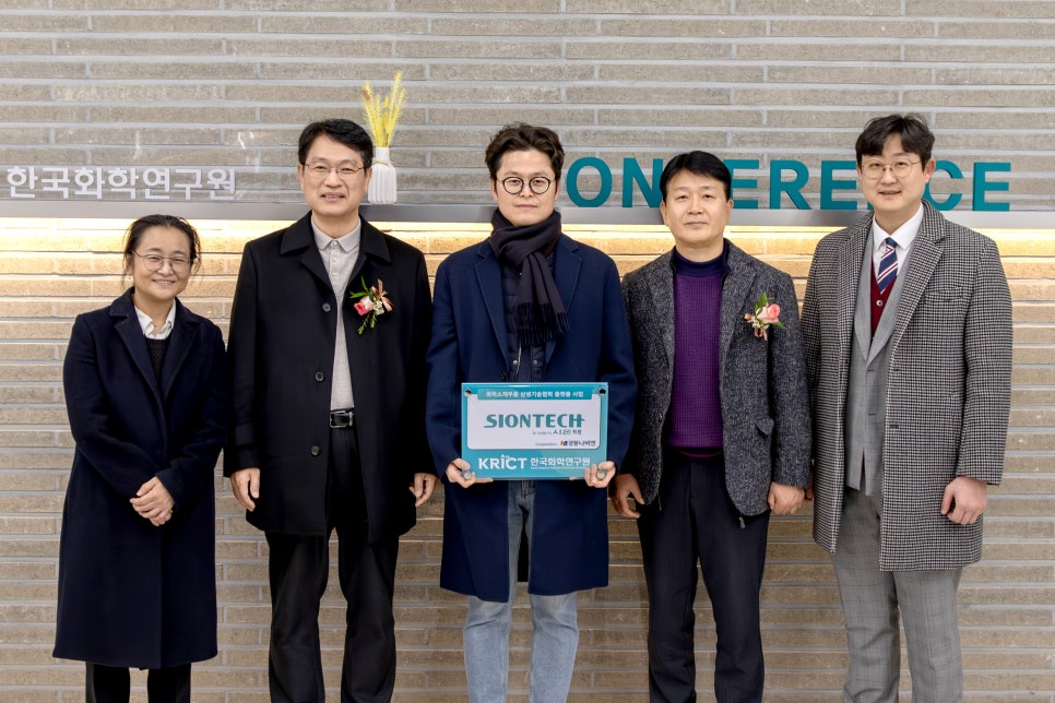 이종용 리뉴시스템 강경석 시온텍 대표(오른쪽 두번째)와 이진희 화학연 박사(가운데),