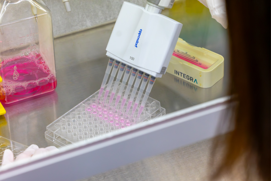 최지우 석사후연구원(1저자)이 혈액 성분을 대식세포로 배양하기 위해 피펫 도구를 이용해 여러 개의 웰(well, 작은 용기)에 옮기고 있다