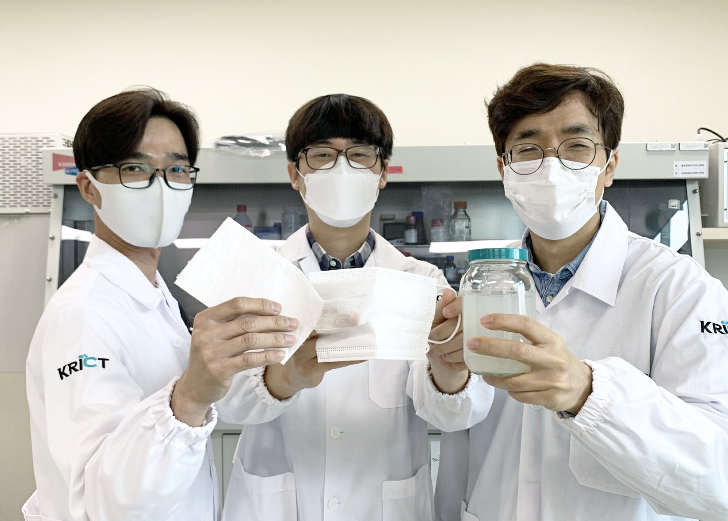 ▲ 한국화학연구원 바이오화학연구센터 황성연(좌)·박제영(중)·오동엽(우) 박사가 ‘생분해성 마스크 필터와 나노키틴 용액’을 들고 있다.
