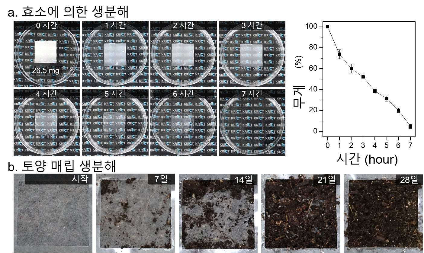 ▲생분해성 마스크필터의 시간에 따른 효소분해 및 무게감소율을 측정한 사진 (a)과 퇴비화 토양에서 28일동안 생분해되는 과정을 찍은 사진이다.
