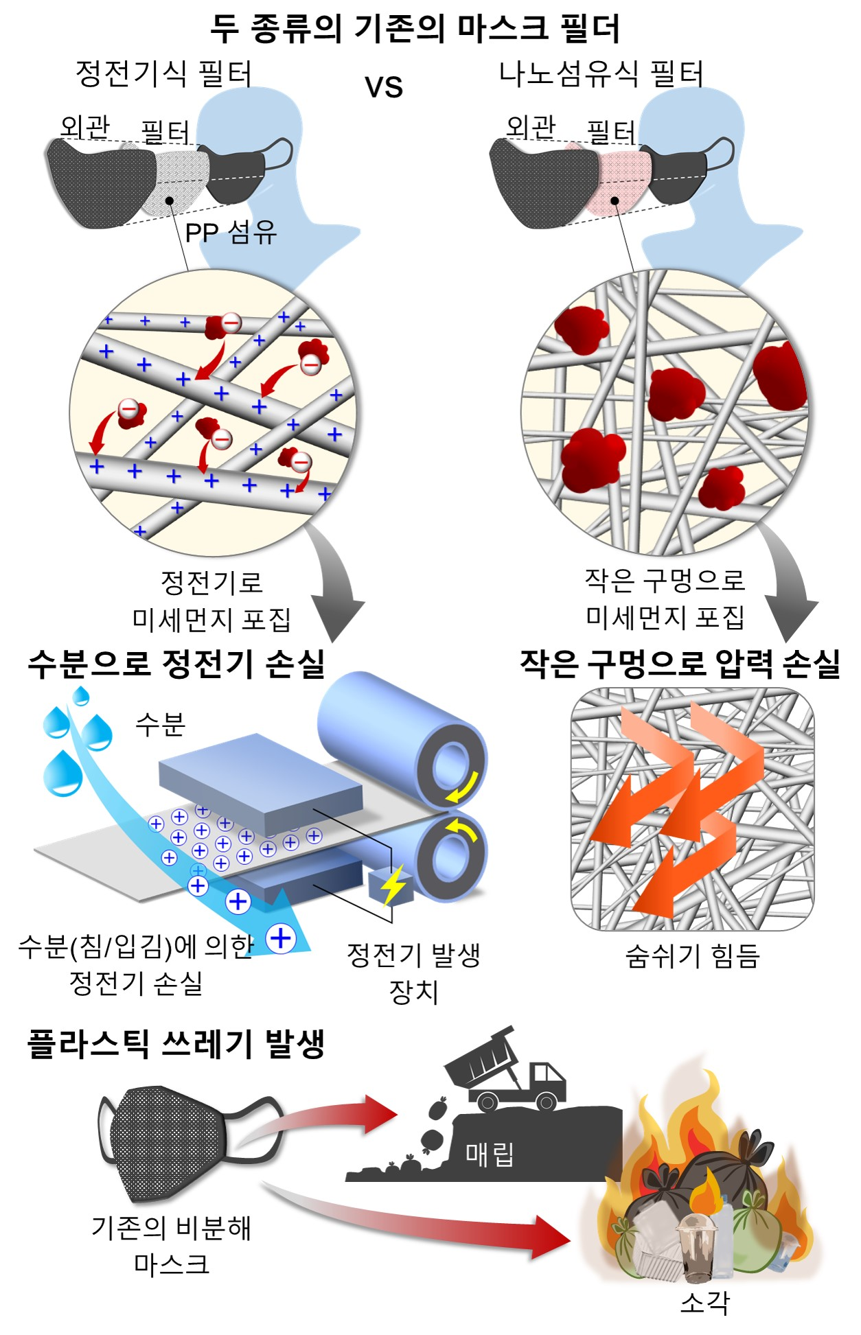 □ 기존 마스크 필터는 보통 두 가지 방식으로 제조된다. 시중 마스크의 90%를 차지하고 있는 정전기 필터 방식은, 플라스틱 섬유 가닥을 교차시켜 공간을 만들고 그 공간에 정전기를 발생시켜서 바이러스나 미세먼지 등을 달라붙게 하는 원리로 제조된다. 그런데 정전기는 건조할 때 잘 일어나기 때문에 습기에 취약하다. 따라서 제품 개봉 후부터 공기 중 습기나 입김의 수분에 노출돼 필터의 정전기 기능이 시간이 지날수록 떨어진다. 또한 정전기가 영구적이지 않고 일시적으로 발생하도록 설계되어있어 필터 기능이 오래 유지되지 않는다.