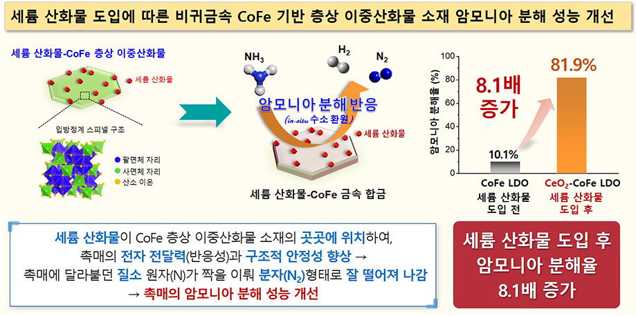 [그림 1] 세륨 산화물 도입에 따른 비귀금속 CoFe 기반 층상 이중산화물 소재 암모니아 분해 성능 개선