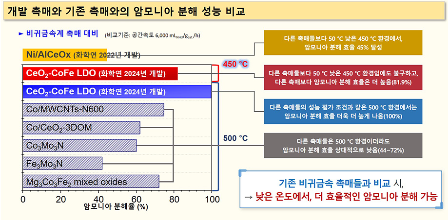 - 이는 코발트-철 촉매 공정(500°C)루테늄(Ru) 촉매 공정 (450°C) 간 공정 온도 50°C 성능 차이를 좁히는 성과를 얻었으며, 그린수소 생산 비용 절감이 기대됨.