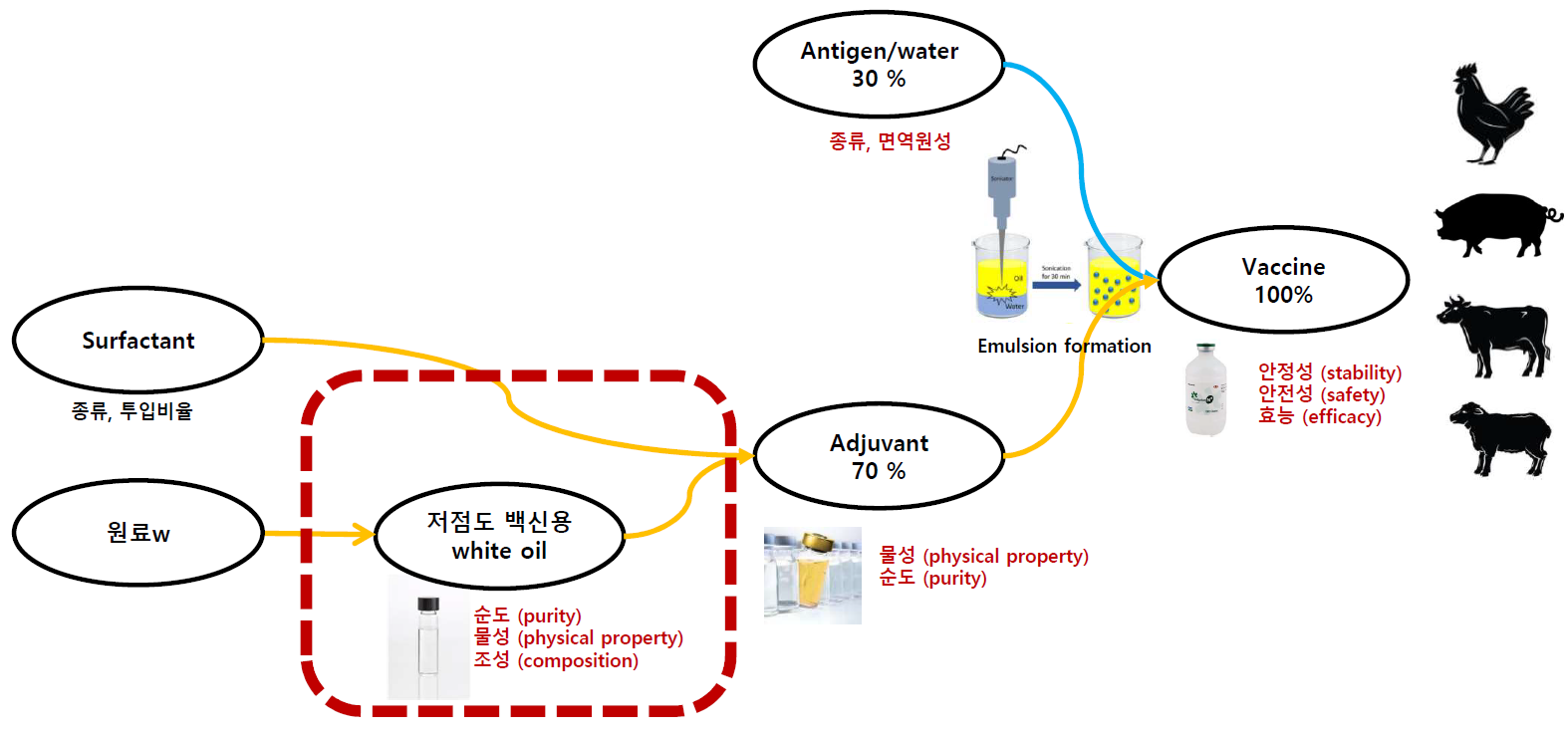 ◦저점도 백신용 화이트오일 개발 - 증류 시스템을 이용하여 개발된 저점도 화이트오일의 안정성 향상 ◦화이트오일 성능 지표 - 순도 (무색, 무취, 무독성) - 물성 (저점도 4.0~7.5 cSt@40, 고유동점-high pour point) - 조성 (탄소수분포 C15~C20+, 고유동점 성분) ◦저점도 백신용 화이트오일 공정 기본 설계 - 화이트오일 개발 및 제조를 위한 공정 시뮬레이션 및 공정 기본 설계 (한국화학연구원) - 공정 기본 설계 기반 공정 상세 설계, 설비 구축 및 운전 조건 최적화