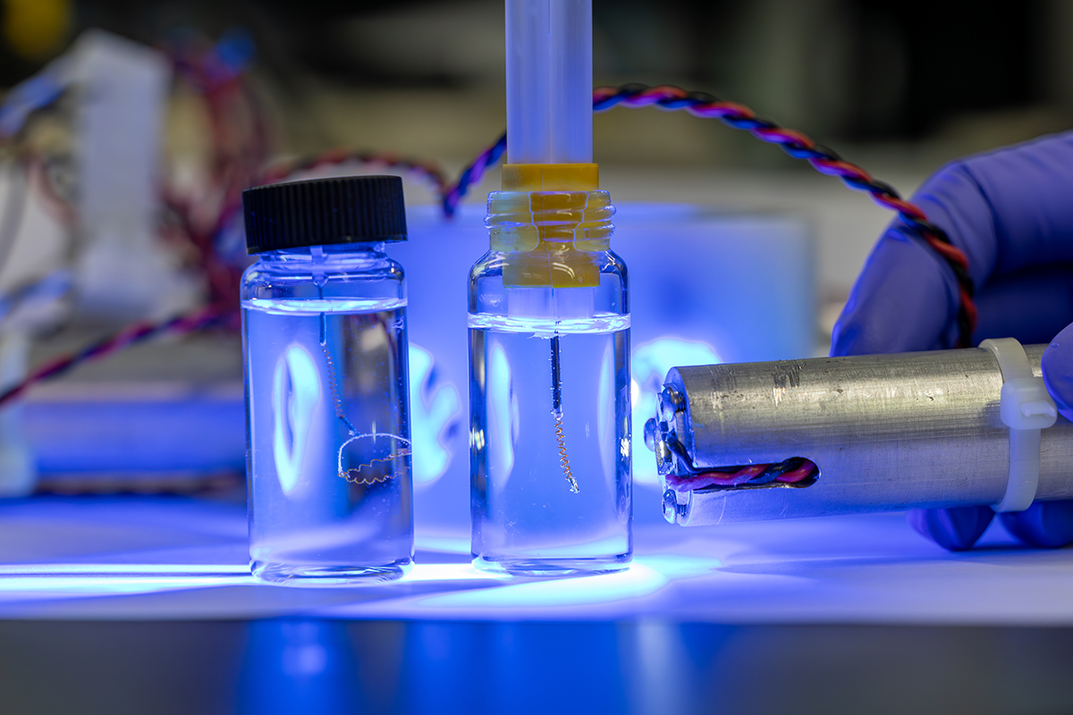 □ [그림 5] AC-LCE 소재로 만든 스프링 구조 인공근육에 자외선을 비춰 동작을 유도하는 모습 |