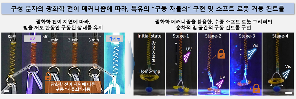 ◯ 또한, 광화학 지연 메커니즘 (빛에 의해 변형된 분자가 원래상태로 돌아오는데 시간이 걸리는 현상)을 이용하여, 한번 빛을 쪼이면 빛을 끄더라도 한동안 수축 또는 이완된 상태가 유지되도록 “구동 자물쇠”를 구현하여, 기존에 대부분의 인공 근육에서 구현되기 힘든 새로운 형태의 순차적 및 공간적 구동 컨트롤이 가능함을 제시하였고, 이를 기반으로 선형 스프링과 원형 스프링을 조합하여 수중 환경에서 복잡한 임무를 수행할 수 있는 그리퍼 및 파이프 크롤러 로봇 등으로 구현하였다.
